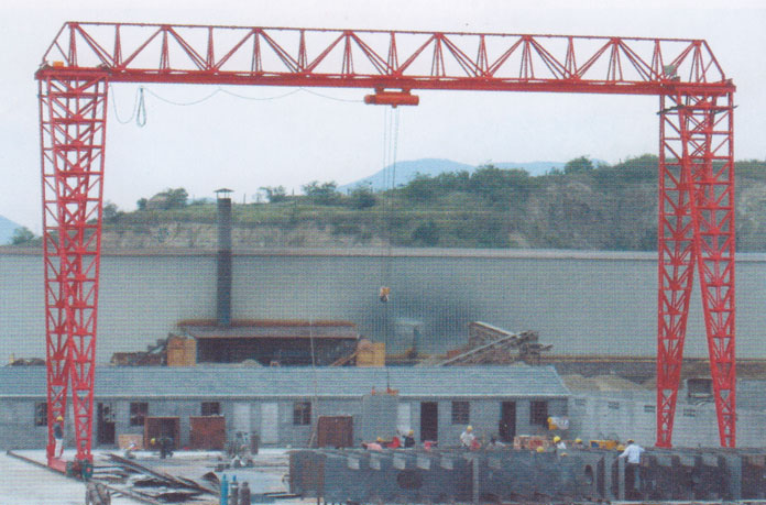 門式起重機是橋式起重機的一種變形,又叫龍門吊。主要用于室外的貨場、料場貨、散貨的裝卸作業(yè)。它的金屬結(jié)構(gòu)像門形框架,承載主梁下安裝兩條支腳,可以直接在地面的軌道上行走,主梁兩端可以具有外伸懸臂梁。門式起重機具有場地利用率高、作業(yè)范圍大、適應(yīng)面廣、通用性強等特點,在港口貨場得到廣泛使用。